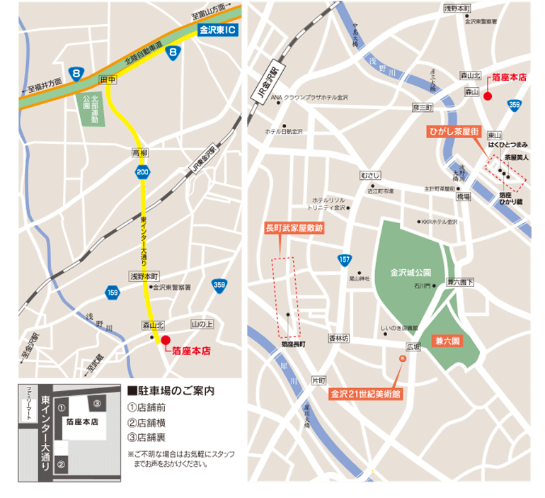 ひがし茶屋街周辺の駐車場まで500m 約2分